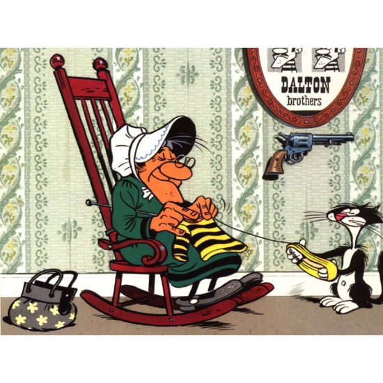 Quoi de plus rassurant, de plus attendrissant que le spectacle d'une petite vieille qui tricote (tic, tic, tic) assise sur son rocking chair (couiic, couiic, couiic)? Méfiez-vous, cette scène d'apparence paisible cache une réalité bien plus inquiétante ! L'ouvrage auquel la bonne femme s'est attelée ressemble fort à un habit de bagnard, c'est vrai, mais le plus effrayant n'est pas là ! Ses traits agressif, malgré son sourire, son front étroit et sa mâchoire proéminente, son regard plein de malice derrière ses lorgnons la trahissent : oui ! C'est bien elle ! La redoutable génitrice des non moins redoutables Daltons ! Elle leur a généreusement légué les pires aspects de sa propre personne : la méchanceté, la convoitise, la sournoiserie ! Et pourtant, en la regardant se balancer sur son vieux fauteuil, on pourrait presque la croire inoffensive....