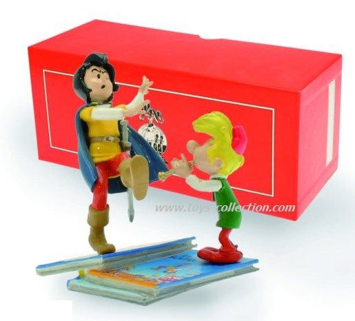 Figurine de Pirlouit jouant de la flute et Johan déséquilibré sur la pile d'albums.