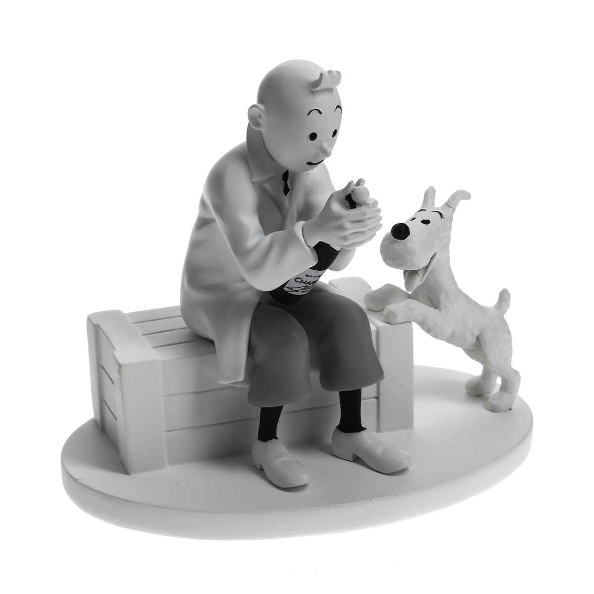 Cette figurine hors série en noir et blanc (en résine) représente une scène de l'album Le crabe aux pinces d'or. Elle a été conçue et fabriquée à partir des albums noir et blanc d'origine. Fasciné par les dessins animés, Hergé s'est totalement investi dans la manière de suggérer le mouvement. Retrouvez tous les commentaires dans le livret cartonné reproduit sur papier identique aux albums de l'époque et livré avec la figurine.